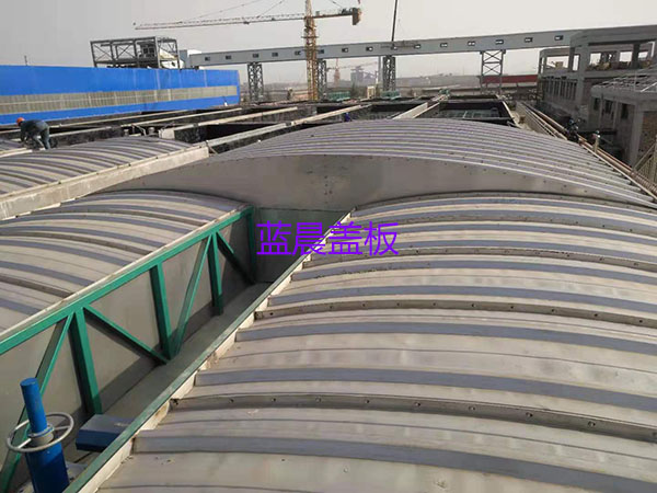 山西灵石某焦化企业污水池加盖除臭工程:加盖面积约1200平米,污水池跨度为3.5~8.6米,采用SUS304不锈钢拱形盖板,不锈钢盖板厚1.0mm。加盖为低盖形式,连接处为橡胶密封条加不锈钢螺栓连接,并根据现场要求设观察口与检修口。
